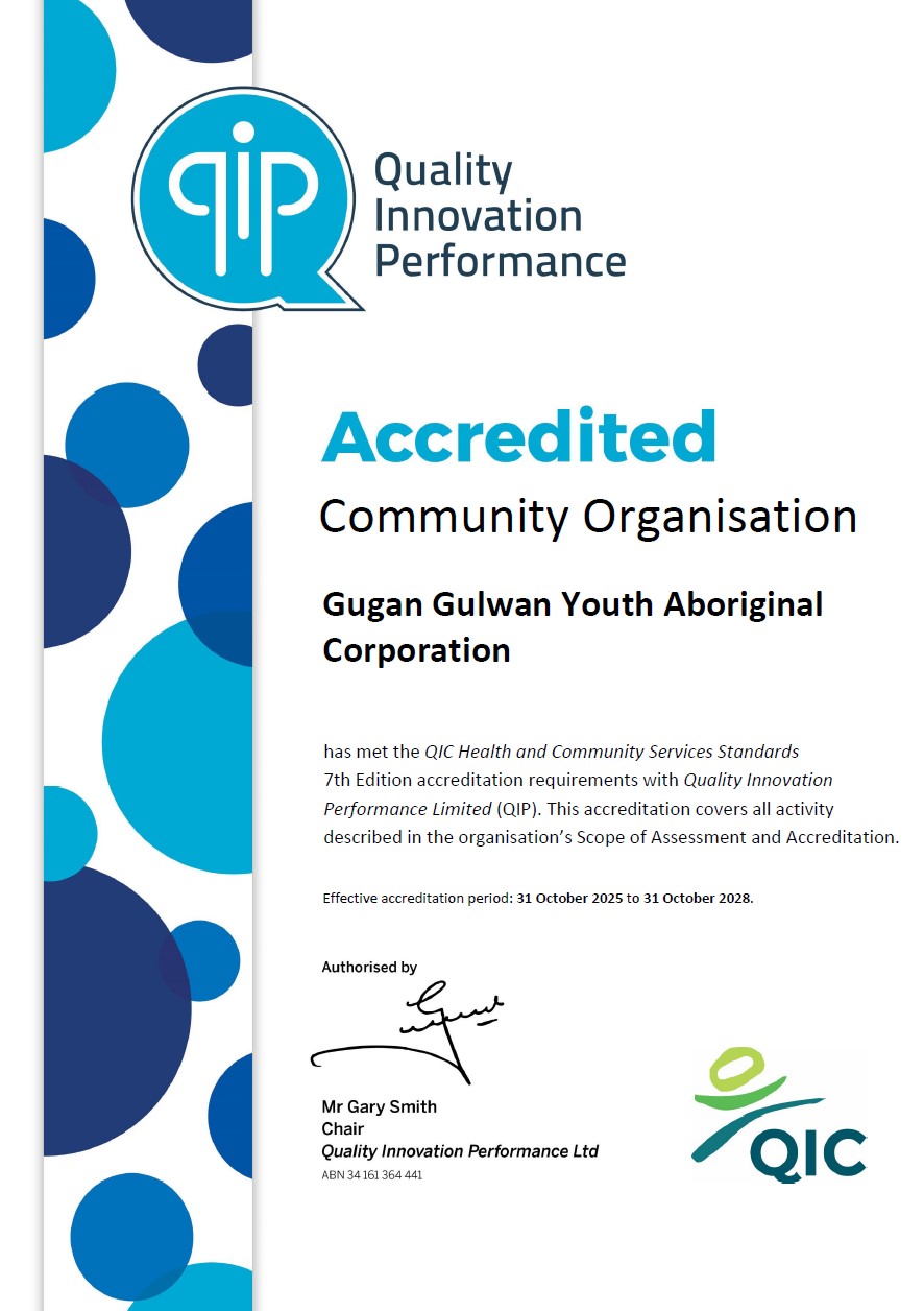 Gugan Gulwan Youth Aboriginal Corporation successfully achieved QIP accreditation on 31 October 2025.